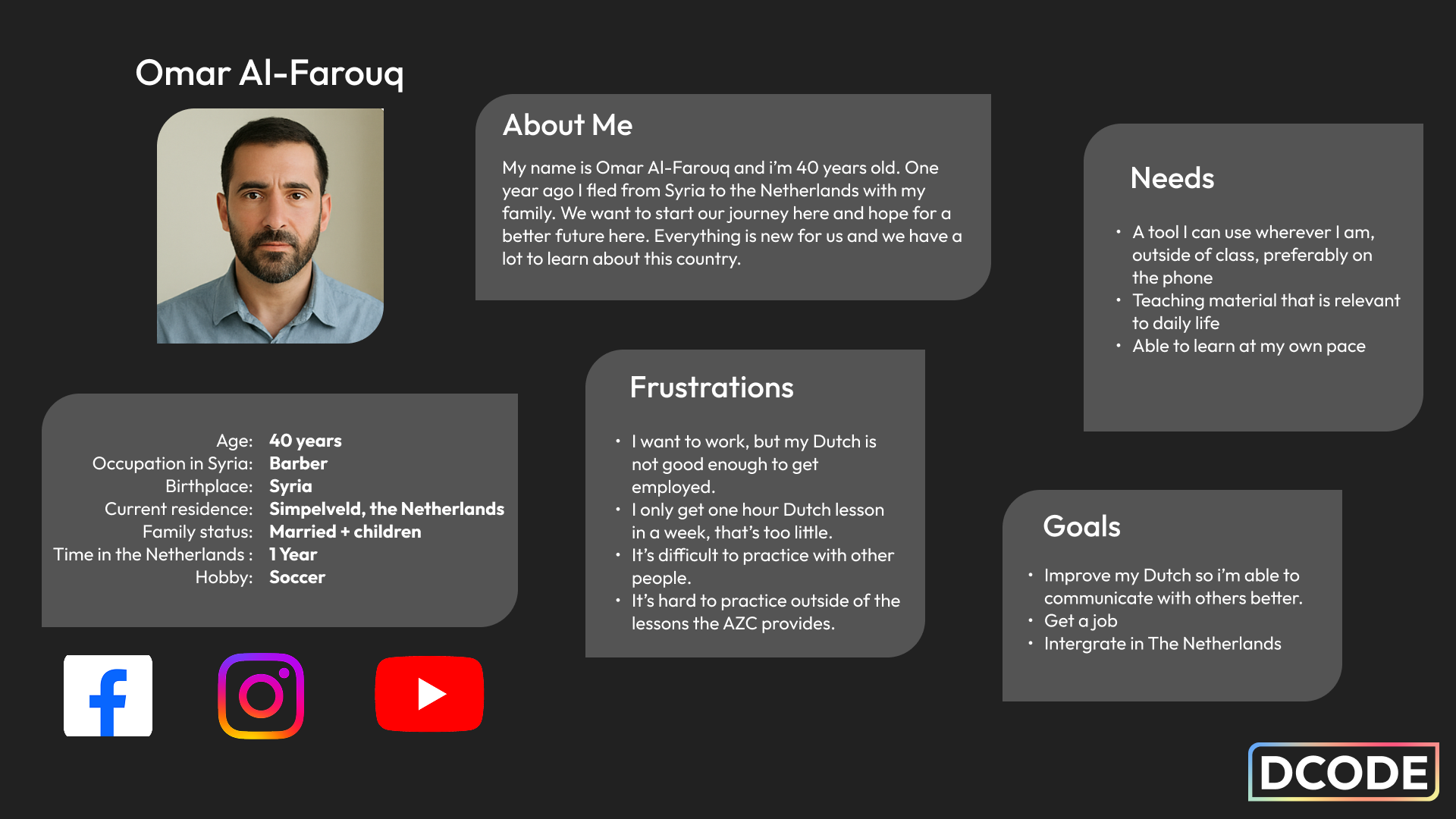 I was able to make the persona by visiting the refugee camp in Simpelveld and having interviews with the refugees that live there and the volunteers who teach them Dutch.